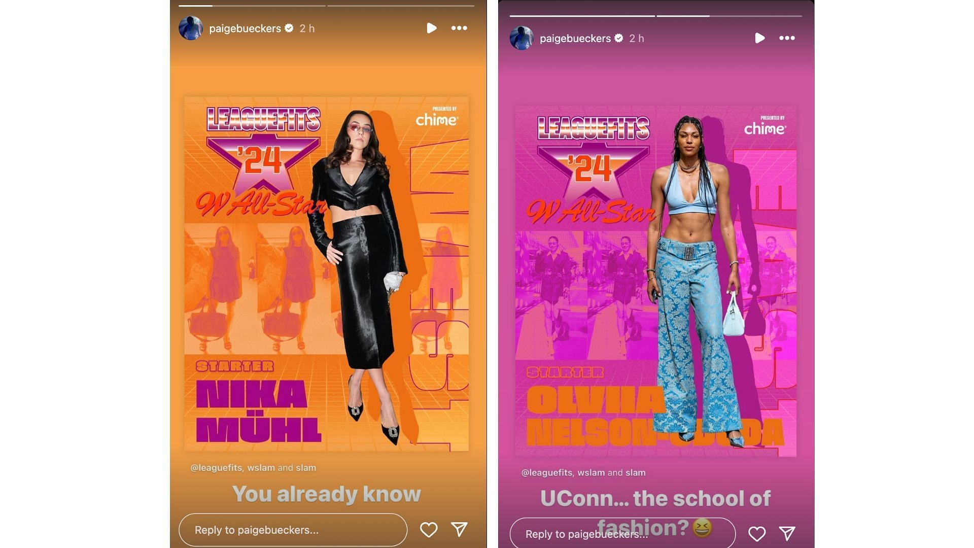 UConn Huskies' Paige Bueckers continues to hype her former teammates and this time it was Nika Muhl and Olivia Nelson-Ododa. The two WNBA stars were picked by LeagueFits as their 2024 WNBA All-Star starters for their impeccable pre-game fashion.