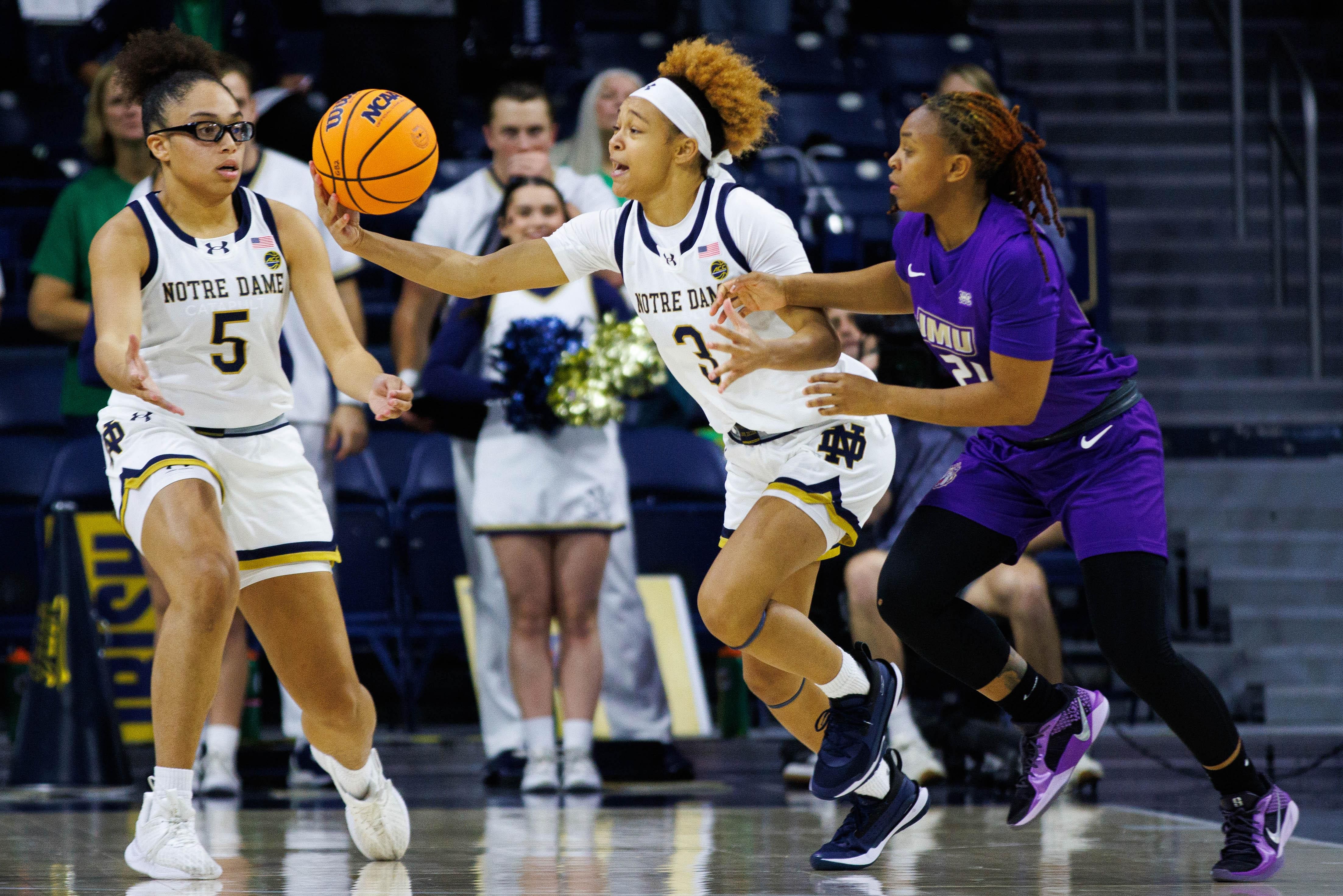 The Fighting Irish took full advantage of USC's careless play, never trailing from start to finish. Hannah Hidalgo and Olivia Miles starred for Notre Dame, combining for 44 points.