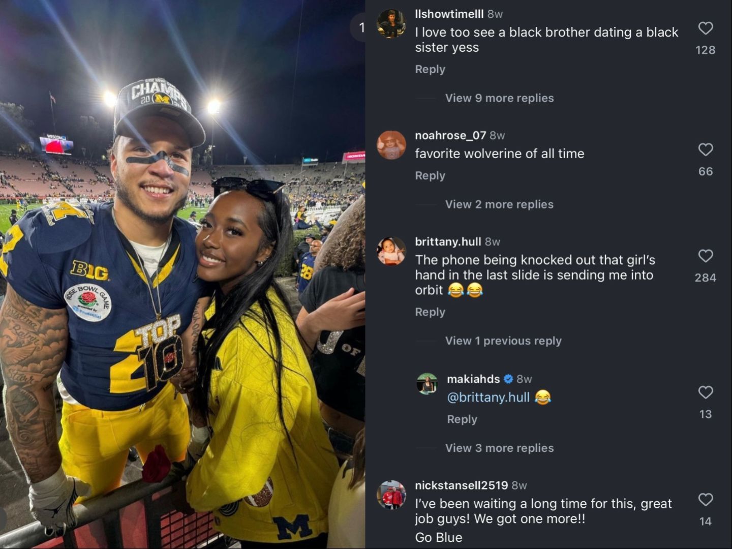 During the 2024 Rose Bowl, when Michigan pulled off a thrilling 27–20 win after Blake Corum's amazing 17-yard touchdown run in overtime, Makiah Shipp was right there by his side cheering him on. And as soon as the game ended, they shared a kiss on the sidelines, soaking in the victorious moment together.