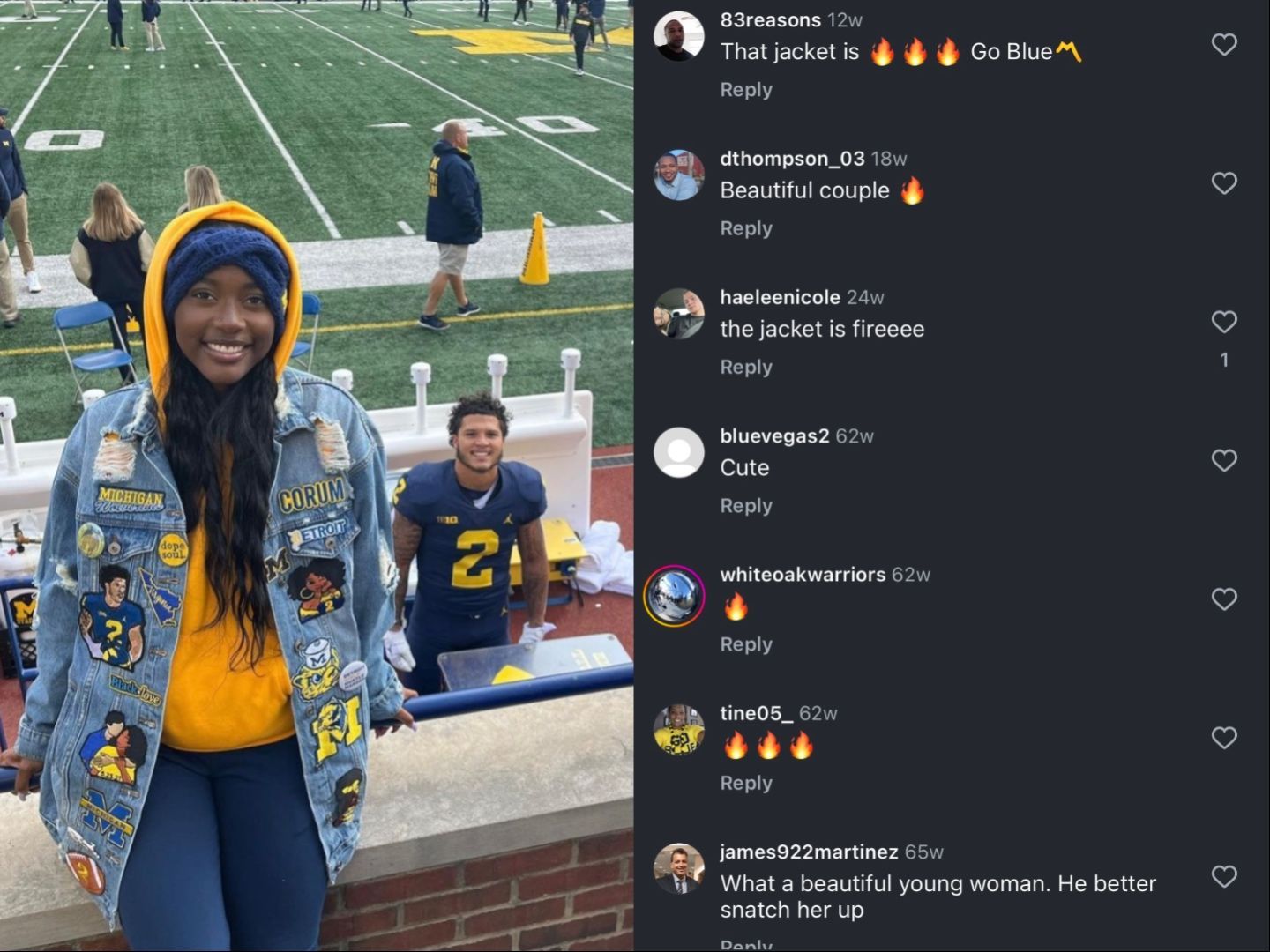 Even though Makiah Shiupp has a limited presence online, that doesn’t stop her from showing support for her boyfriend. During the season, Shipp showed up on the sidelines to support Corum at Michigan Stadium. She shared a snap of themselves on the sidelines. She wore a customized denim jacket over her yellow hoodie. The jacket had Corum’s name and face embroidered on it.