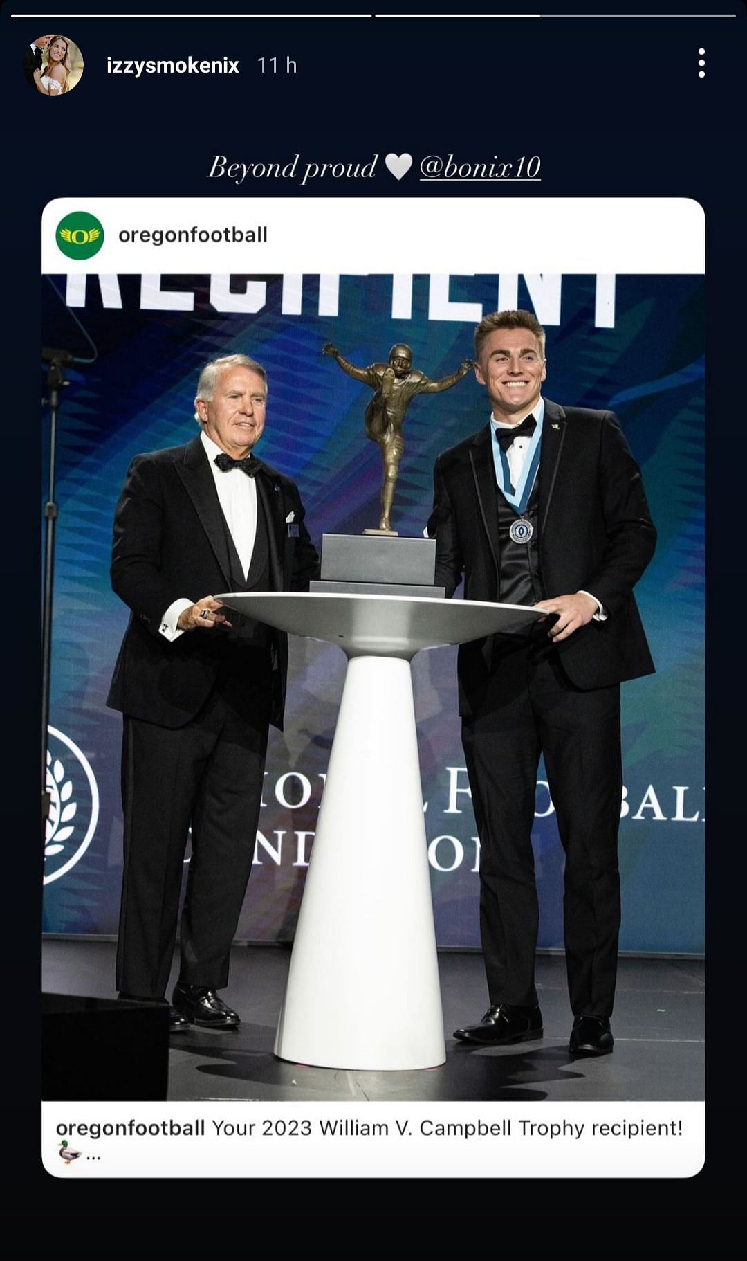 On Monday, during the 65th Annual National Football Foundation Awards Dinner, Bo Nix was announced as the 2023 William V. Campbell Trophy winner.