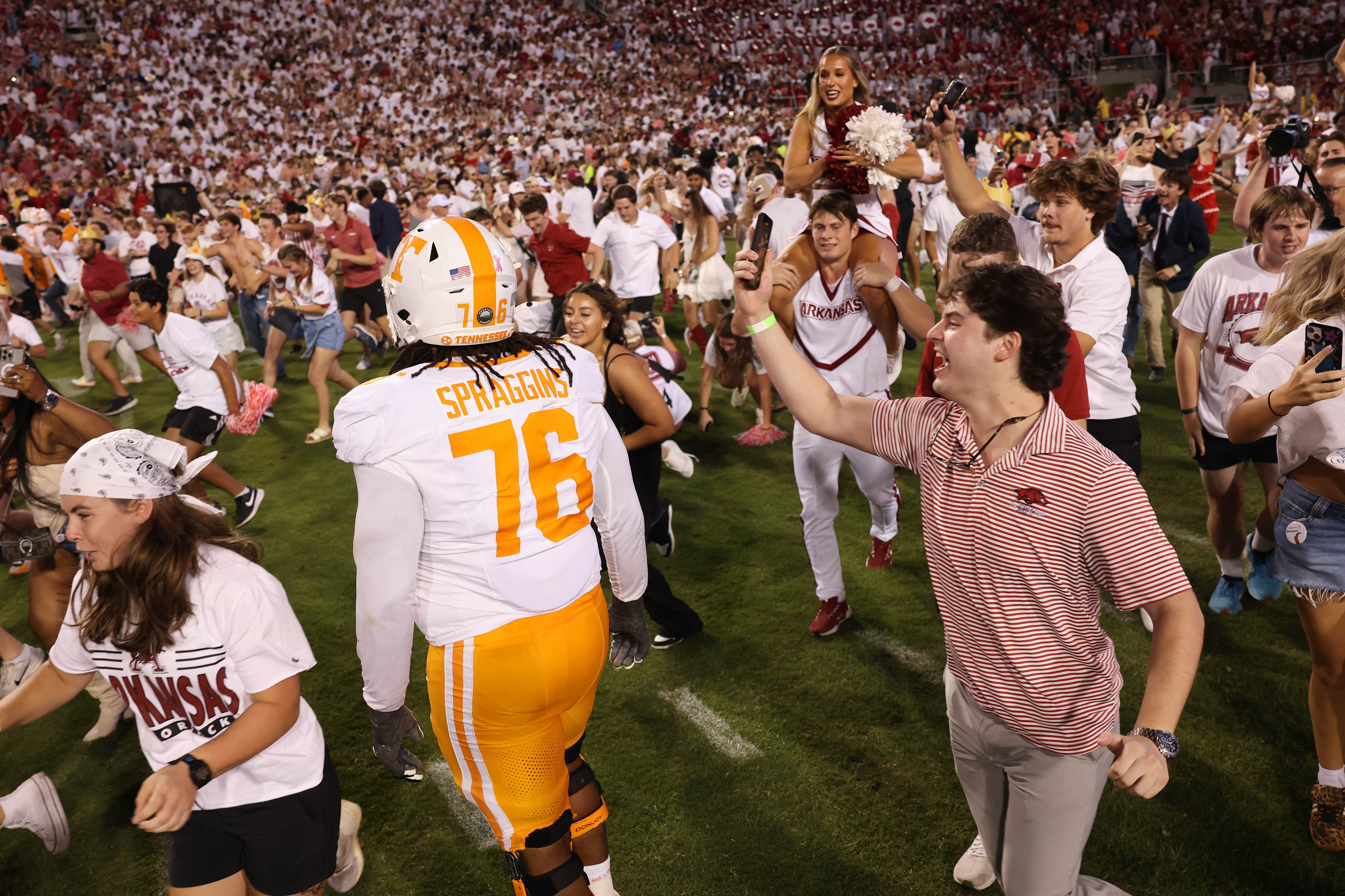 Iamaleava hadn't yet stepped back up when the Razorbacks faithful had already stormed the field in Fayetteville. Visibly moved, Arkansas coach Sam Pittman spoke with ESPN's Holly Rowe after the win.