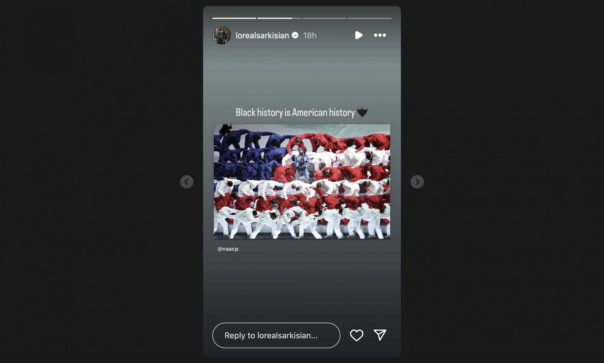 Loreal Sarkisian focused on a different moment: Kendrick Lamar in the middle of an American flag made up by his dancers. Sarkisian took the opportunity to share a story on Instagram with a picture of that sequence and a short message.