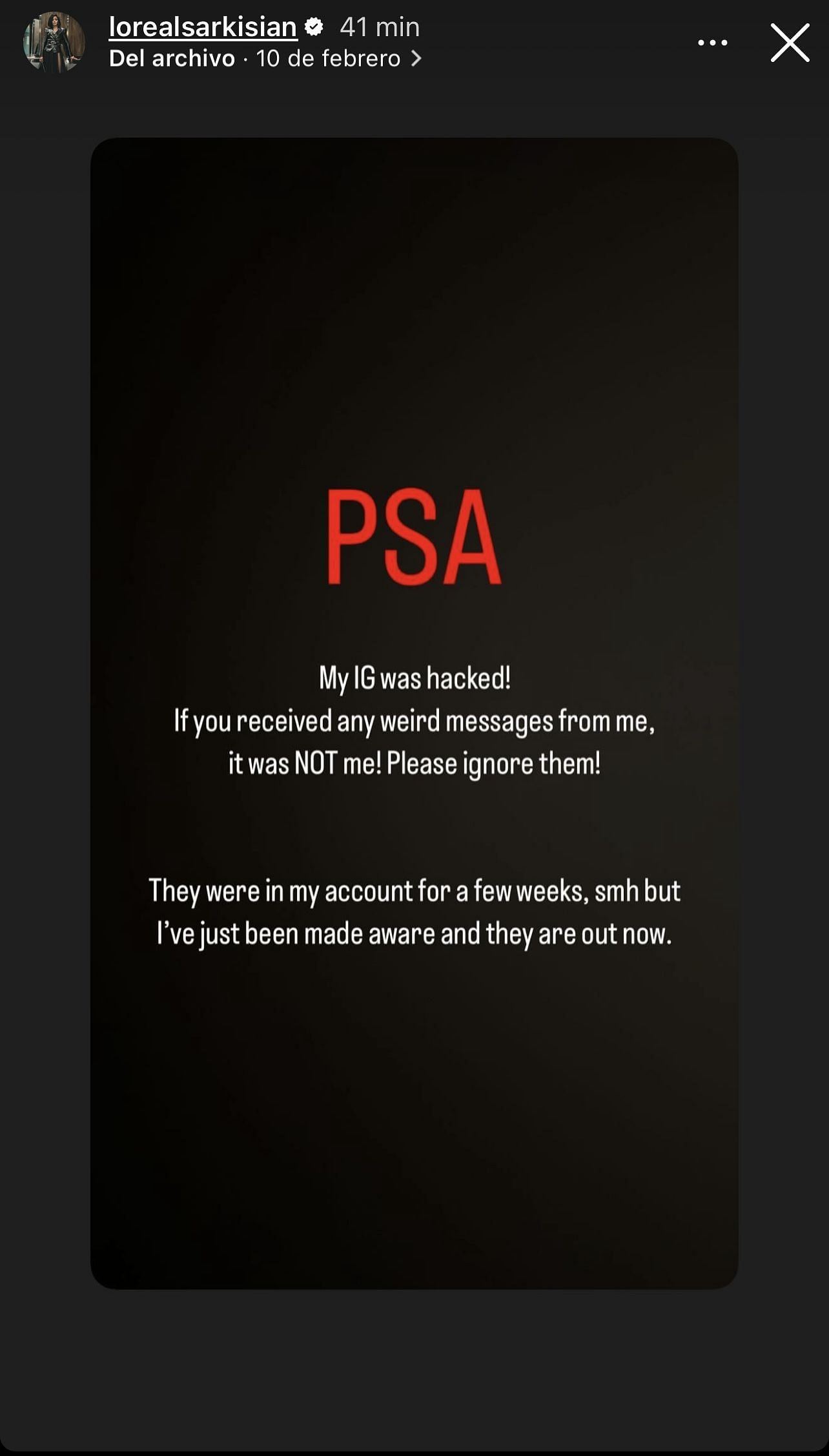 “PSA My IG was hacked! If you received any eird messages from me, it was NOT me! Please ignore them! They were in my account for a few weeks, smh but I’ve just been made aware and they are out now.” Loreal Sarkisian wrote.