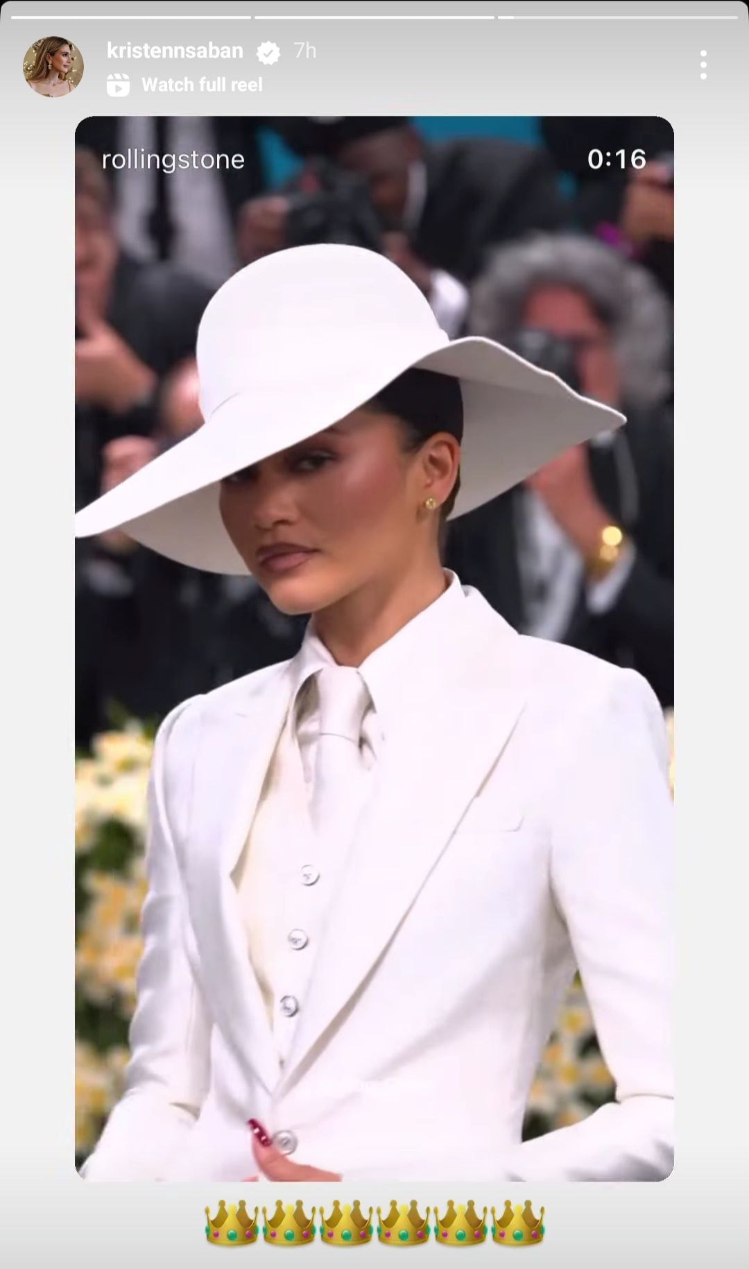 On Monday evening, the fashion-forward Kristen took a break away from defending her father to marvel at some of the stunning costumes at the 2025 Met Gala. The ever-supportive Saban reposted a picture of actress Zendaya's stylish white outfit on her Instagram stories and captioned the image with crown emojis.