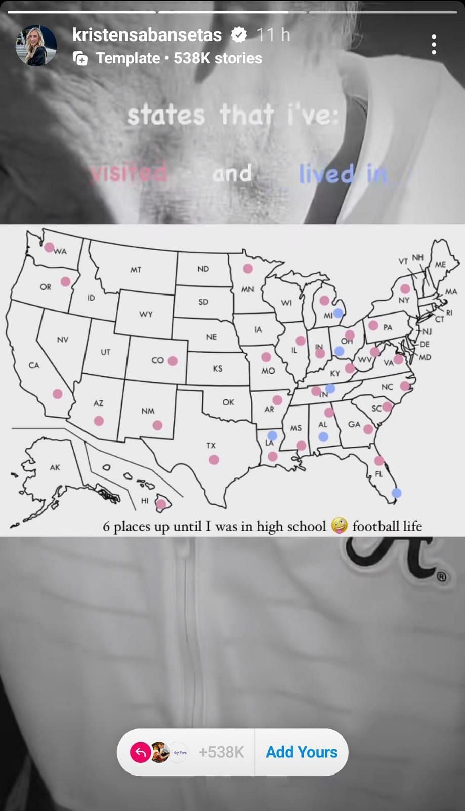“Six places up until I was in high school. Football life,” Kristen wrote while sharing a map of the country.