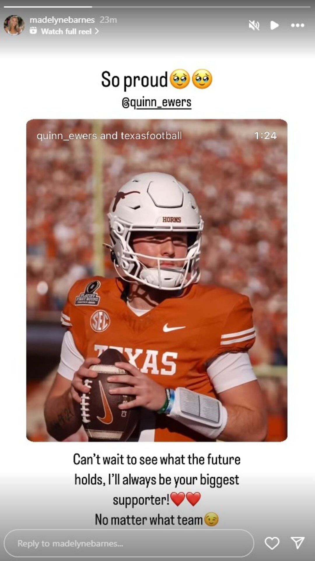 With the deadline set for Wednesday, Ewers finally announced that he would be declaring for the draft. His girlfriend, Madelyn Barnes, sent him a heartwarming message. She posted on her Instagram story, expressing her excitement for his journey in the pros.
