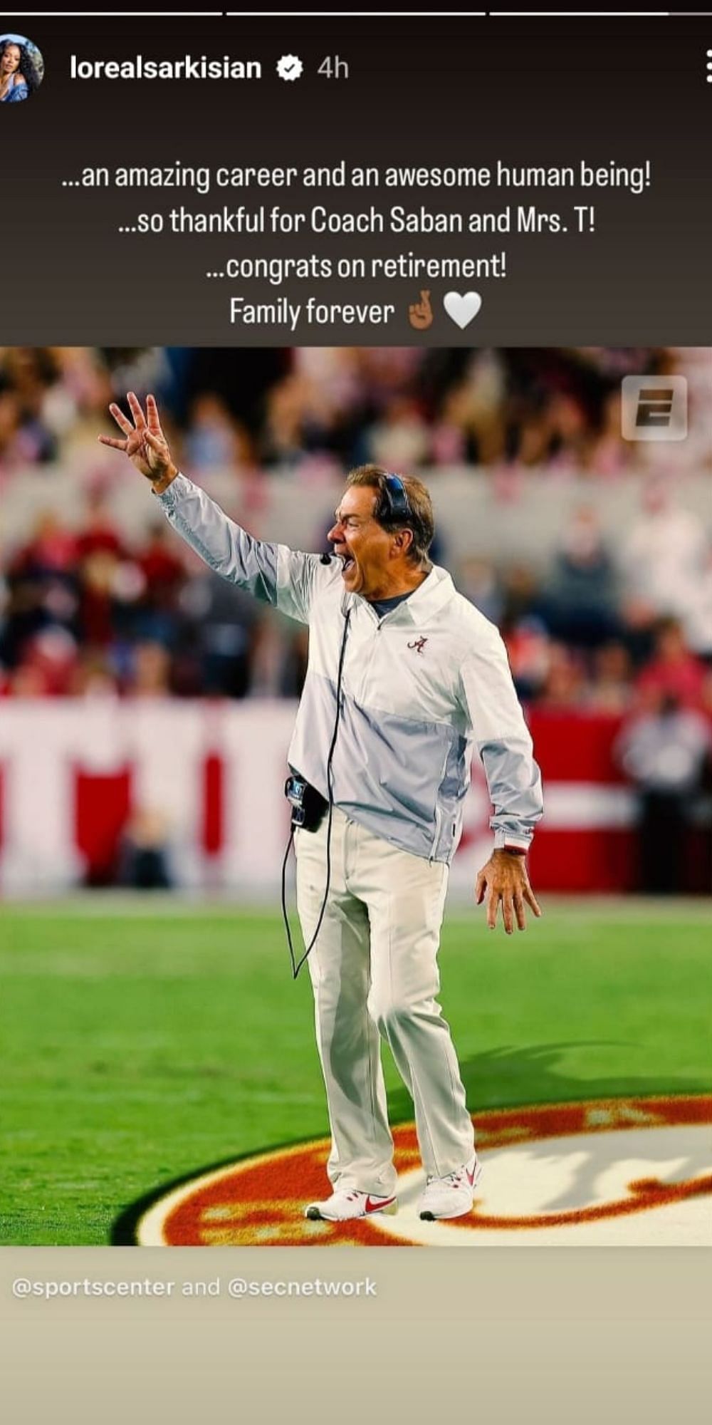 “An amazing career and an awesome human being! So thankful for Coach Saban and Mrs. T! Congrats on retirement! Family forever,” Loreal wrote in her Instagram story.