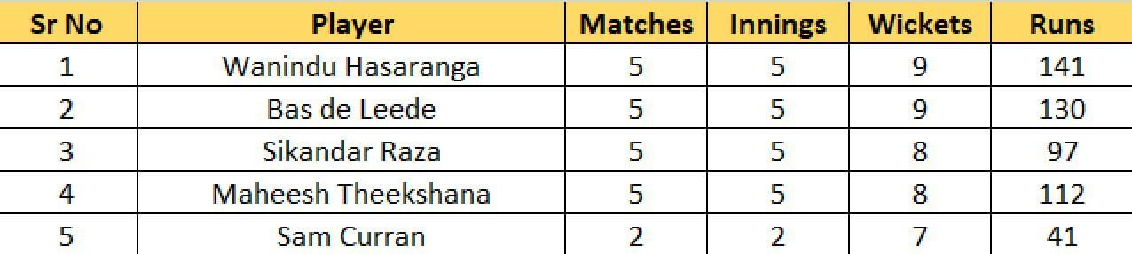 Maheesh Theekshana of Sri Lanka has grabbed eight wickets in five games and follows Raza. The spinner averages 14 with the ball and is bowling well in the tournament. He will look to move up the ladder in the upcoming games.