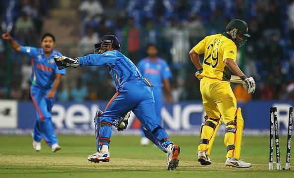 Team India started the 2011 World Cup on a winning note by beating the Australians in their first warm-up game at Bangalore. Australia's eternal weakness once again led to their downfall as the Indian spinners bamboozled the men in yellow.