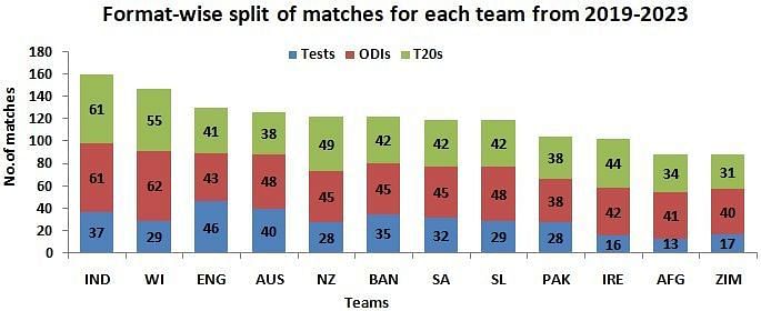 Over the next 4-year cycle, India play the maximum number of matches across all formats (159) followed by WI’s 146. The rest all are quite some margin behind these 2 teams.