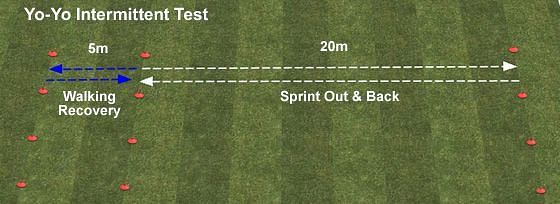 The Yo-Yo test is basically a sprinting test where players have to run from one cone to another, separated by 20 meters before a beep and then return back to the first cone within the next beep. This double sprint is called a ‘shuttle’.