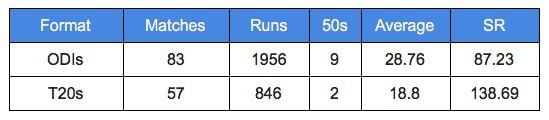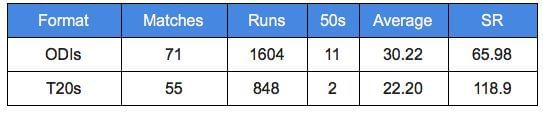 The belligerent Afghan bats at number six or seven and normally plays the role of a finisher in the team. His batting strike rate and the average are a testimony to his hitting abilities and temperament. Zadran is also honing his off-spin bowling skills.