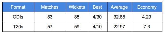 Mohammad Nabi bowls off-breaks and is known for his accuracy and shrewdness while bowling. When it comes to batting he is very tenacious and has a sound technique. His international stats: