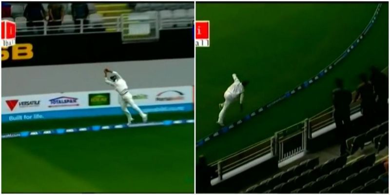 McCullum cleared his front leg and hammered a back of length ball from Ishant Sharma. Positioned at long-on, Jadeja grabbed the catch before realising that his inertia was going to carry him past the boundary rope. Showing great awareness, he tossed the ball up with his left hand. Upon returning from beyond the fence, he duly completed one of the best catches around the rope in the traditional format.
