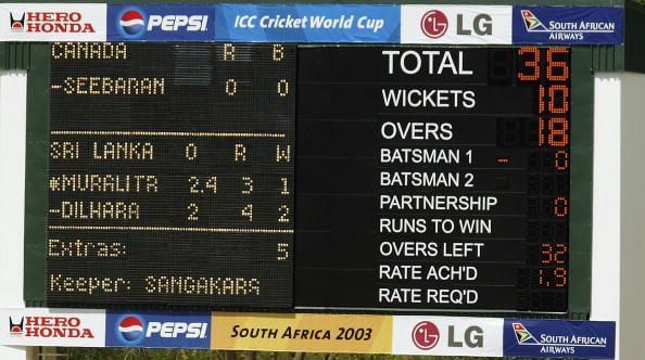In the group stage match of 2003 World Cup being held in South Africa, Canada were bowled out for 36.Once again, it was Sri Lanka who delivered the hammering with a similar line-up ripping through the opposition batting.