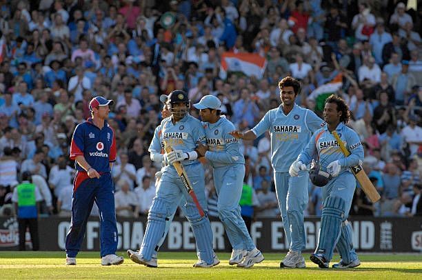 India, in reply, got off to a good start with Ganguly (53), Sachin (94) and Gambhir (47) all playing crucial knocks. However, England hit back and India's innings crumbled. It was left to Dhoni and Uthappa to salvage the match with the run-rate climbing up.