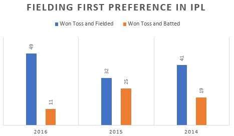 No matter what the eventual result of the match is, the numbers quite distinctively suggest that the IPL teams and captains show enormous confidence in the philosophy that their teams are better placed to win matches batting second. The statistics below shows that teams have opted to bat second in approximately 69% of the times after winning the toss across all IPL matches in last 3 years (2014-2016).
