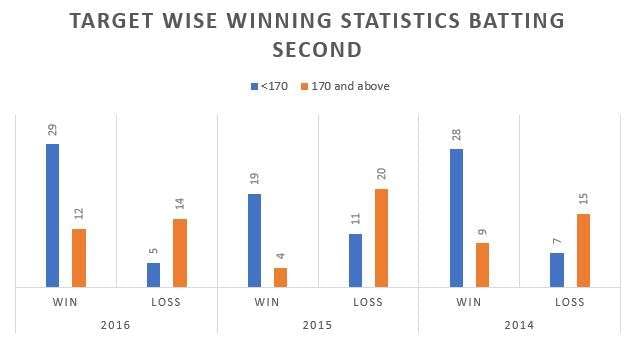 The fact that teams are becoming more competitive and continuously maturing to play this format of the game resonates well while explaining this. As the above statistics suggest, teams have started to absorb scoreboard pressure better, day by day. Teams batting second are surpassing more 170+ targets (46% winning ratio in 2016 against 16% and 38% in 2015 and 2014 respectively) now than the earlier days.