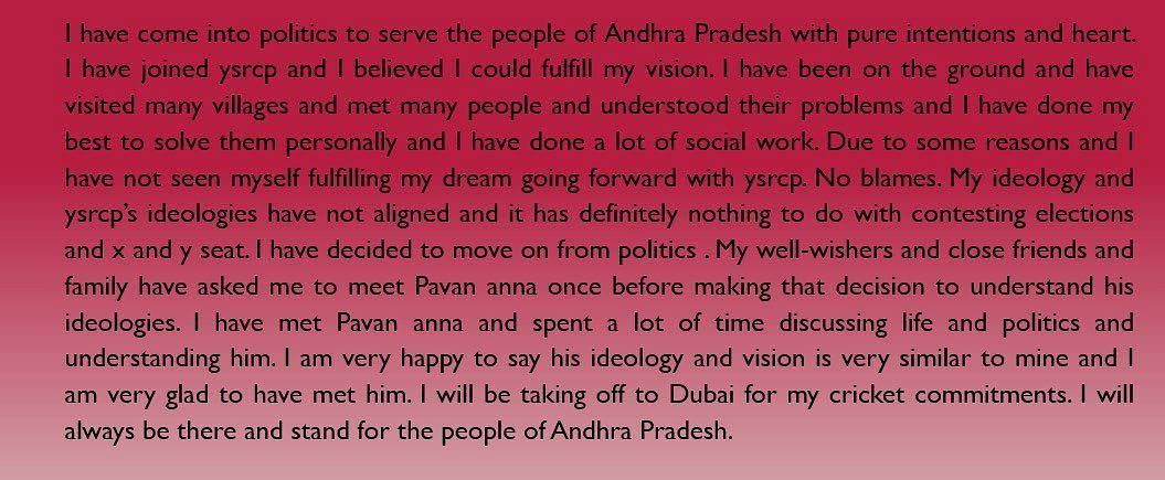 There is no proper output about his Charity works, but, Recently, He joined Politics to do some kind of social service. He wanted to move from village to village, so that, he could meet people living there and help them. However, on the 6th of Jan, 2024, He quit the YSRCP Party and stayed out of Politics. Later on, He clarified that he had to go to Dubai for his cricket commitments. He doesn’t want to do social service while playing cricket. He also said that he would always be there and stand for the people of Andhra Pradesh.