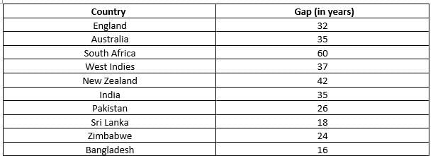 South Africa’s gap of 60 years is quite remarkable, but we mustn’t forget that, from the above table, it is the only gap which includes two World Wars, each of which removed close to seven years of Test cricket. West Indies, New Zealand and India all have the second World War included in their ‘gap’.