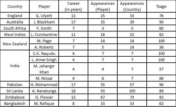 Considering a fairly long career in terms of Test matches, only Ranatunga, Flower and Hanif had a very impressive proportion of matches played during their active careers.