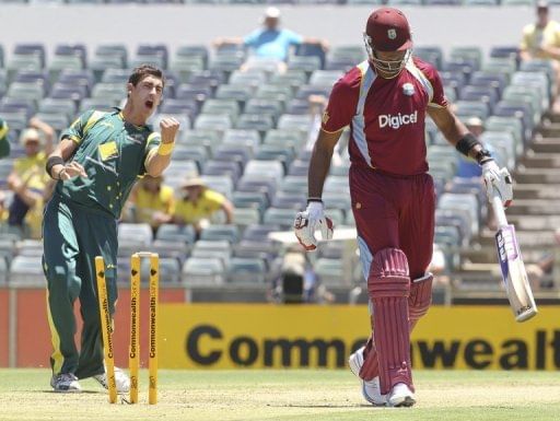 Australia’s Mitchell Starc (L) celebrates taking the wicket of West Indies batsman Kieron Pollard during the one-day international on February 1, 2013. Starc claimed five wickets as the West Indies were bundled out for just 70 on their way to an embarrassing defeat.