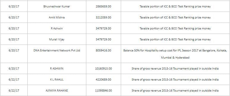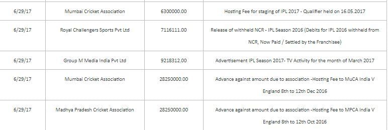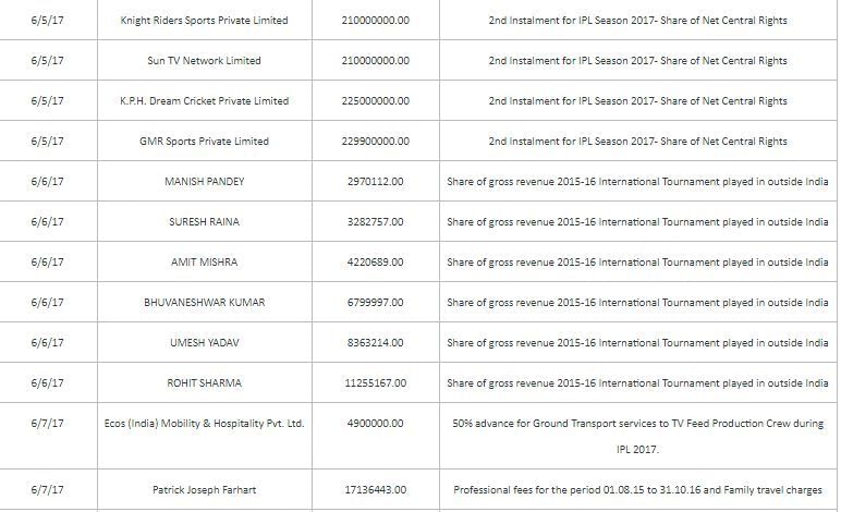 On its website, bcci.tv, the Board recently divulged its payments made above Rs. 25 lacs for June 2017, revealing some hefty figures. The tables, in no particular order, has names ranging from players and support staff to IPL franchises and team hotels.