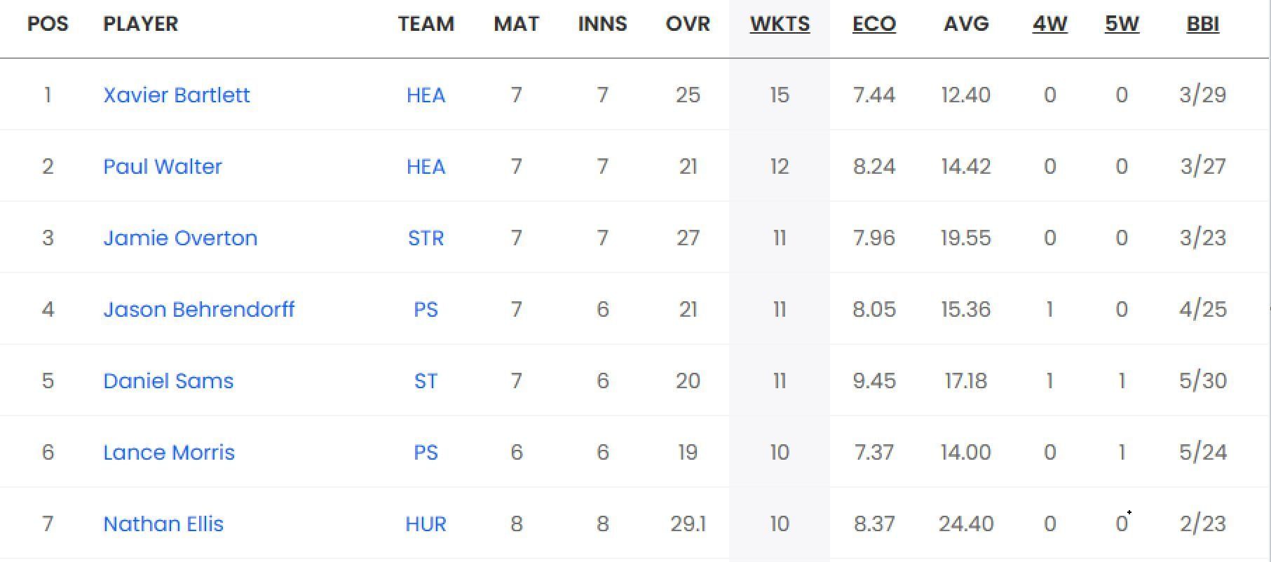 His teammate, Paul Walter is second in the list, having picked up 12 wickets from seven matches at an economy rate of 8.23. Jason Behrendorff of the Perth Scorchers is among the wickets as well, having taken 11 wickets from six innings at an economy rate of 8.04.