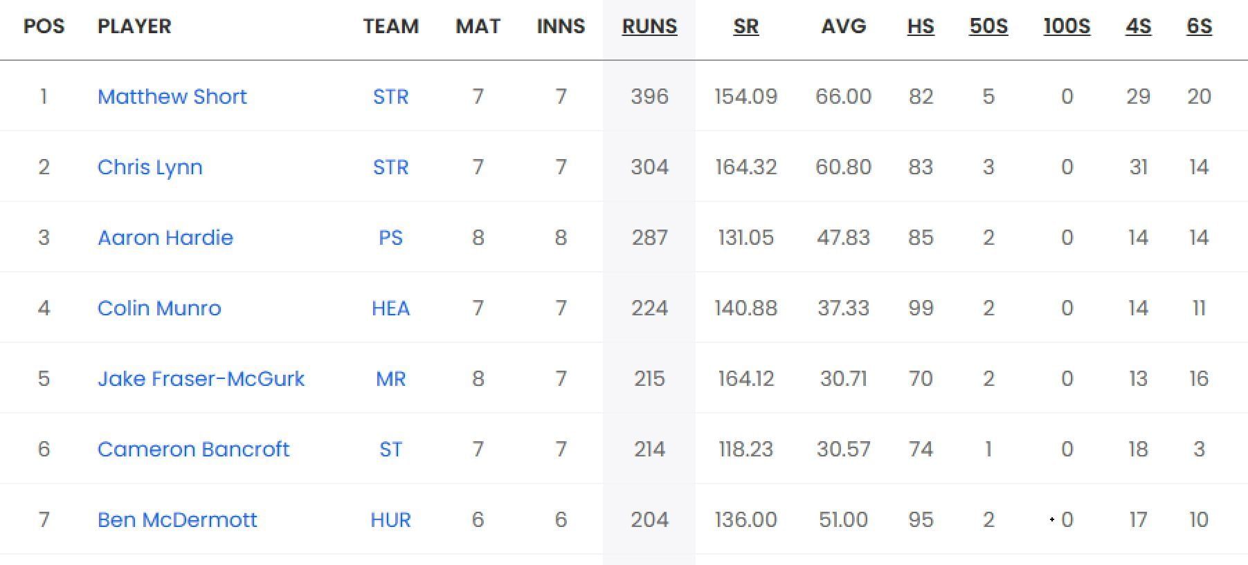 Second on the list is Chris Lynn, Short’s Strikers teammate, having scored 304 runs from seven games. He has an average of 60.80 and a strike-rate of 164.32 with three fifties and a top score of 83 not out to his name.