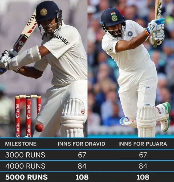 When it comes to the milestones, Pujara has completed his 5000 test runs in his 108th inning against Australia. Coincidentally, Dravid had also taken the exact same number of innings to complete his 5000 test runs. Furthermore, both Dravid and Pujara completed their 3000 and 4000 runs in exact same numbers of innings, 67 and 84 innings respectively.