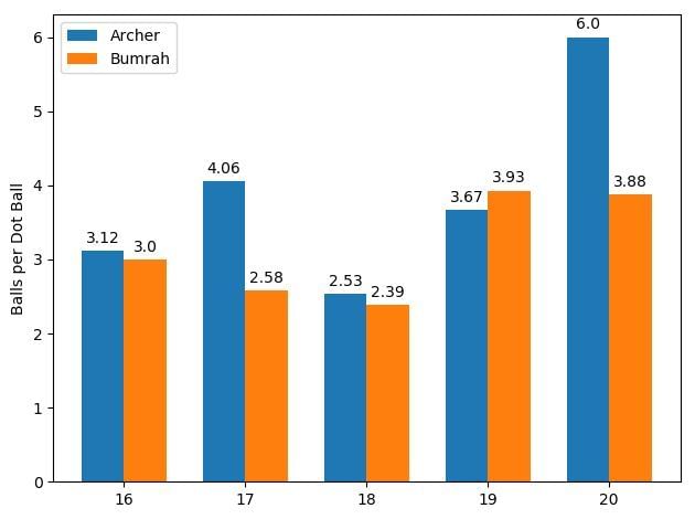 Both Bumrah and Archer have similar balls per dot ratio for overs 16 to 19, but Bumrah's balls-per-dot ratio of 3.88 in the 20th over of the innings is significantly better than Archer's 6.0. This show's Bumrah's ability to restrict the batsmen from scoring in even the last over of the innings. This helps his team to restrict the total while bowling first and winning close games while defending.