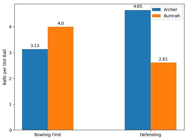 The following graph shows the balls-per-dot ratio for Bumrah and Archer while bowling first and while defending a total.
