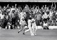 Fans run in to congratulate Kapil Dev after he took the catch to dismiss Viv Richards in the 1983 World Cup final.