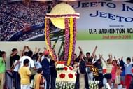 An eleven feet high replica of the World Cup trophy, made up of flowers, being displayed at UP Badminton Academy in 2011