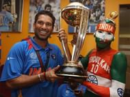 Sudhir Kumar Chaudhary poses with Tendulkar after India became the world champions in 2011