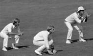 #4 Mike Brearley placing a helmet at short mid-wicket