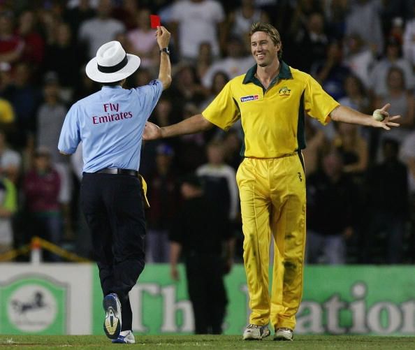 The first instance came in 2005 at the first ever T20 International between New Zealand and Australia at Eden Park, Auckland.Glenn McGrath tried to finish off the game by attempting to bowl an under-arm delivery and was promptly shown the red-card for his actions.