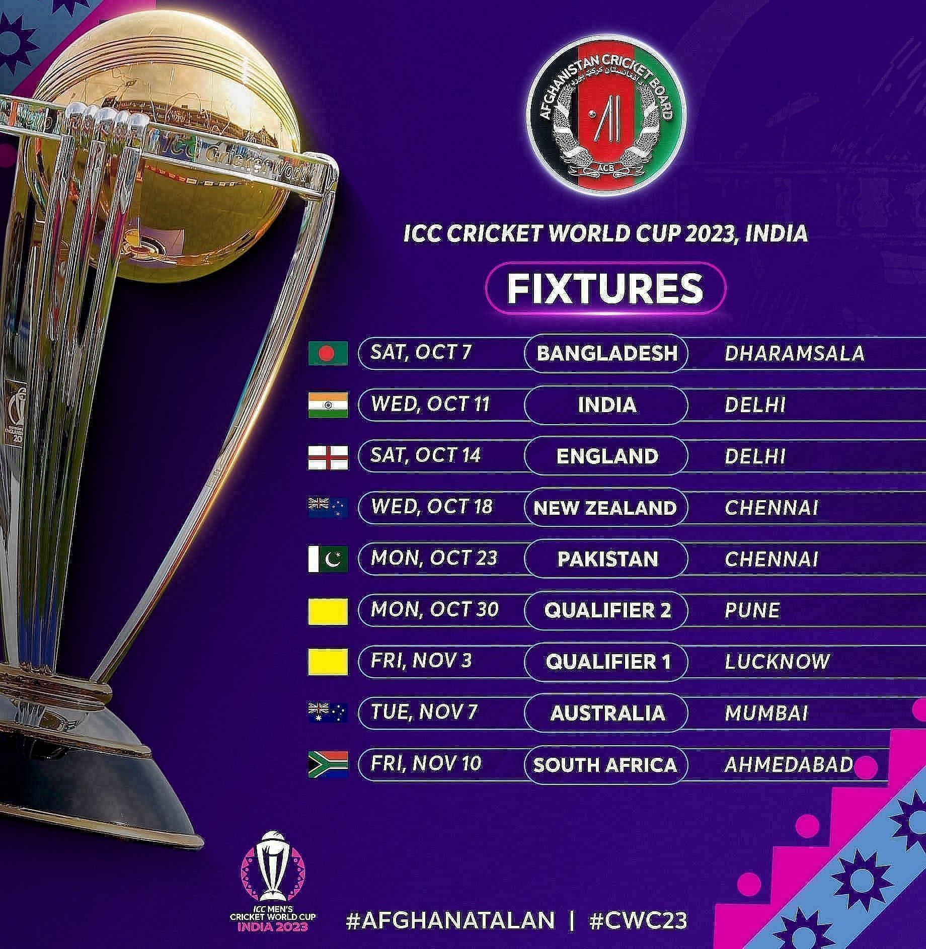 1 | October 07, 2023 | Afghanistan v Bangladesh | 10:30 AM | Himachal Pradesh Cricket Association Stadium, Dharamsala |