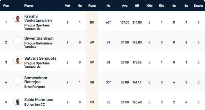 Divyendra Singh of Prague Barbarians Vandals is second on the list of highest run-getters. He has scored a total of 69 runs in the two matches so far with 39 as his highest score. Singh has been relatively more circumspect with a strike rate of 138.00, although he has struck 8 fours and 2 maximums.
