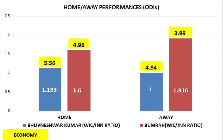The graph tells the story. Bumrah almost picks 2 wickets on away soil every match. No matter if it is home or away, this duo had consistently proved to be an obstacle for the opposition with a mind-blowing economy and by grabbing wickets on a frequent basis.