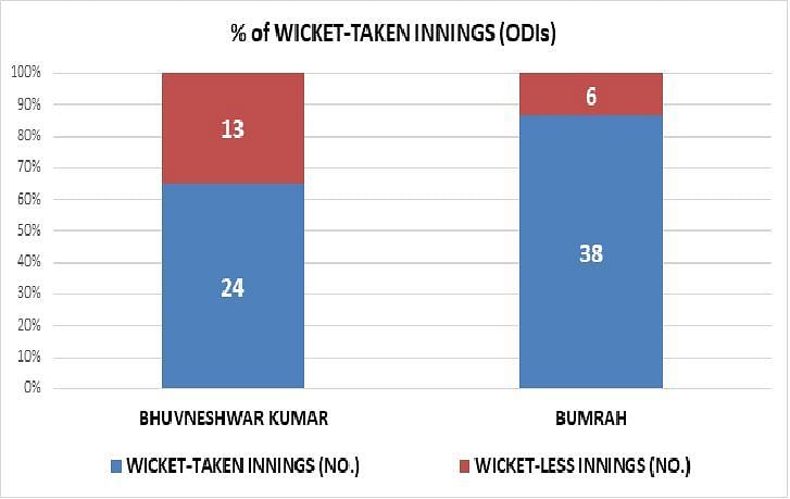 Virat Kohli seems to be have been blessed in this case, as this duo had dismissed batsmen at least once in 65% and 86% of the ODI matches respectively. This factor is more crucial in T20Is, and this duo has had their share of wickets in 62%(Bhuvneshwar Kumar) and 77%(Bumrah) of the T20I matches respectively. These numbers are mind-boggling.