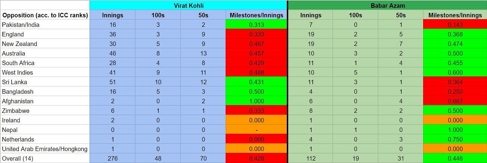 The opponents are ranked in ascending order of the latest ICC men's ODI rankings for teams. Since the Pakistan captain has played fewer than half of Kohli's ODIs, we have used milestones/innings as our parameter.