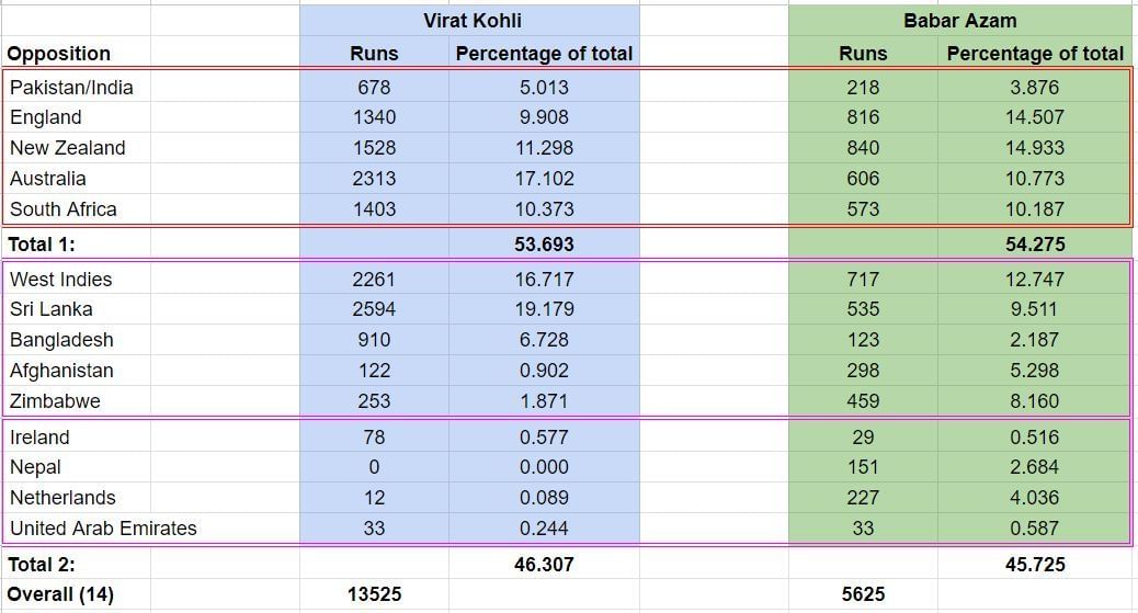 Both have accumulated runs against top-tier and lower-tier teams. Had Kohli played more matches against Zimbabwe and Babar against Bangladesh, they'd still probably have had the same number of runs.