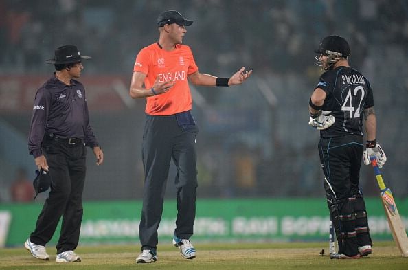 Stuart Broad reacting after the 2014 World T20 match between England and New Zealand. New Zealand won by 9 runs via the D/L method.
