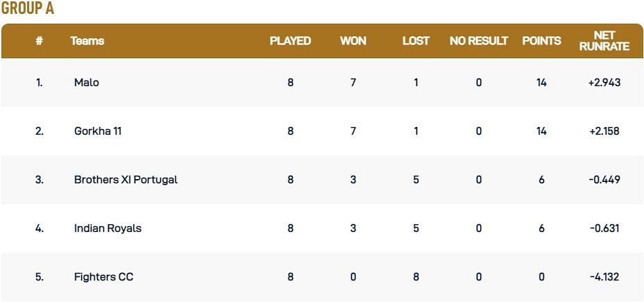 Following are the team standings in both groups after the eighth day of matches in the ECS Cartaxo T10 League 2022: