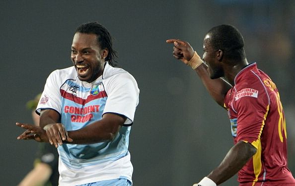West Indies cricketer Chris Gayle (L) and captain Darren Samy celebrate victory over Australia during the ICC World Twenty20 tournament at The Sher-e-Bangla National Cricket Stadium in Dhaka on March 28, 2014.