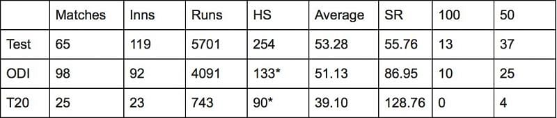 Hashim Amla currently sits in the top 10 of the ICC Batting Rankings in all three formats, but isn't in the top 5 of any. The South African currently averages 49.00 in Test Matches and over 50 in ODIs. Those figures are mightily impressive and outline his consistency at the very top level of the international game.