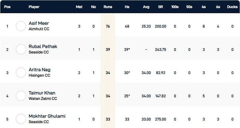 Asif Meer of Almhult CC is the highest run-scorer after the first day of action in the Gothenburg T10 League 2020. He has amassed 76 runs in the three matches he has played, which includes a 48-run knock, the highest score of the league so far. He has an impressive strike rate of 200.00 and has struck 8 fours and 4 sixes.