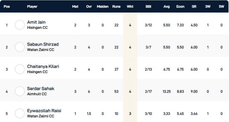 Chaitanya Kilari, Jain's teammate at Hisingen CC, is in the third position with a superior average and economy rate compared to Sardar Sahak of Almhult CC. He has taken a couple of wickets in both the matches he has played, with 2/13 as his best figures.